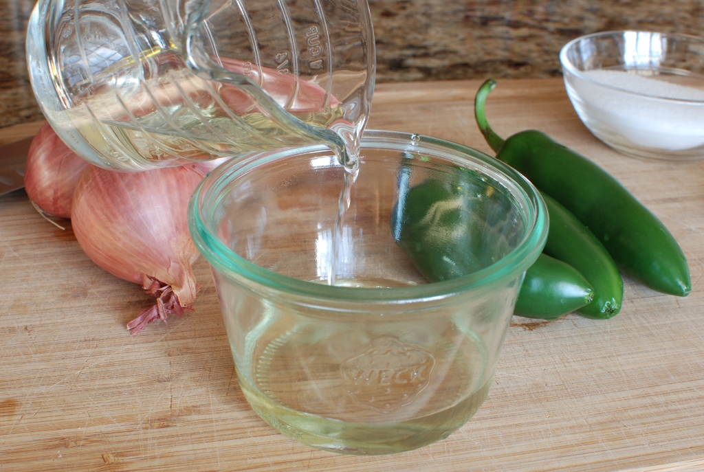Add the jalapenos to the vinegar mixture.