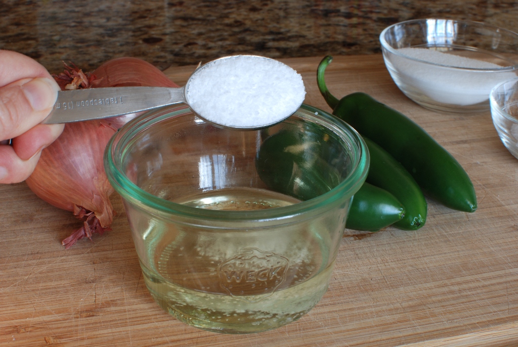 You will need two small bowls. Pour 3/4 cup vinegar into each bowl and mix in 1 teaspoon salt and 1 tablespoon sugar into each bowl of vinegar. Stir to dissolve. Thinly slice jalapenos and add to one of the bowls. Peel and slice shallots and place in the other bowl of vinegar. Cover tightly and refrigerate overnight.