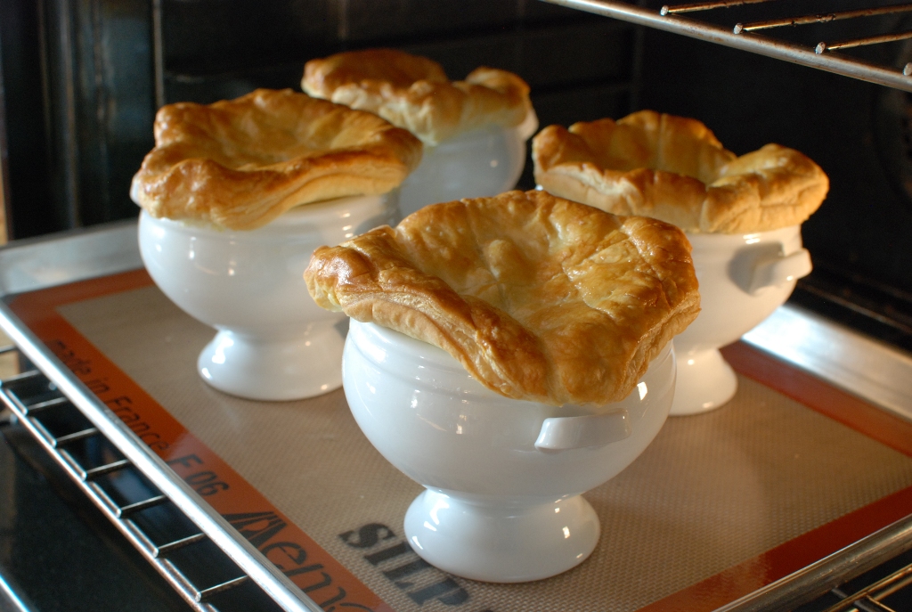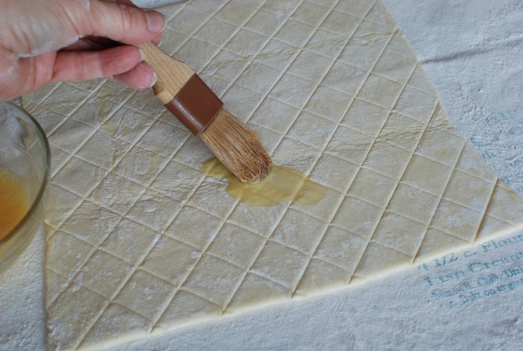 Place the puff pastry sheet on a lightly floured work surface. Slightly roll out to an 11 x 11-inch square. Using a sharp knife, score the pastry with diagonal lines about 2 inches apart, forming a diamond pattern. Brush the pastry with the egg mixture. Cut the pastry into 4 equal squares. Place the pastry, egg wash side up, over the bowls and press the edges to seal. Repeat for remaining pastry to make 4 additional pies.