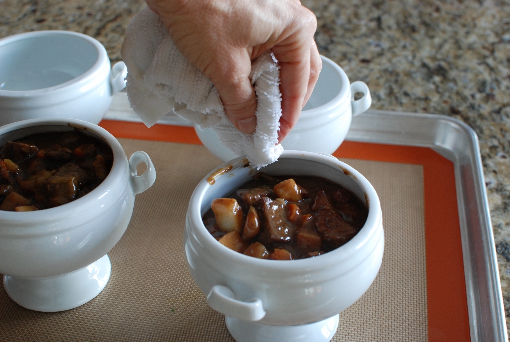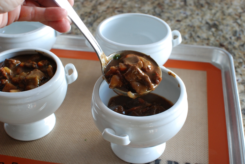 Reduce the heat to medium. Add the bacon and cook, stirring occasionally, until crisp, 6 to 8 minutes. Add to the bowl with the beef. Pour off the excess fat in the pot. Increase the heat to medium-high, add the mushrooms and cook, stirring occasionally, until tender, about 5 minutes. Add to the bowl with the beef. Add the carrots and potatoes, cook for about 5 minutes and add to the bowl.