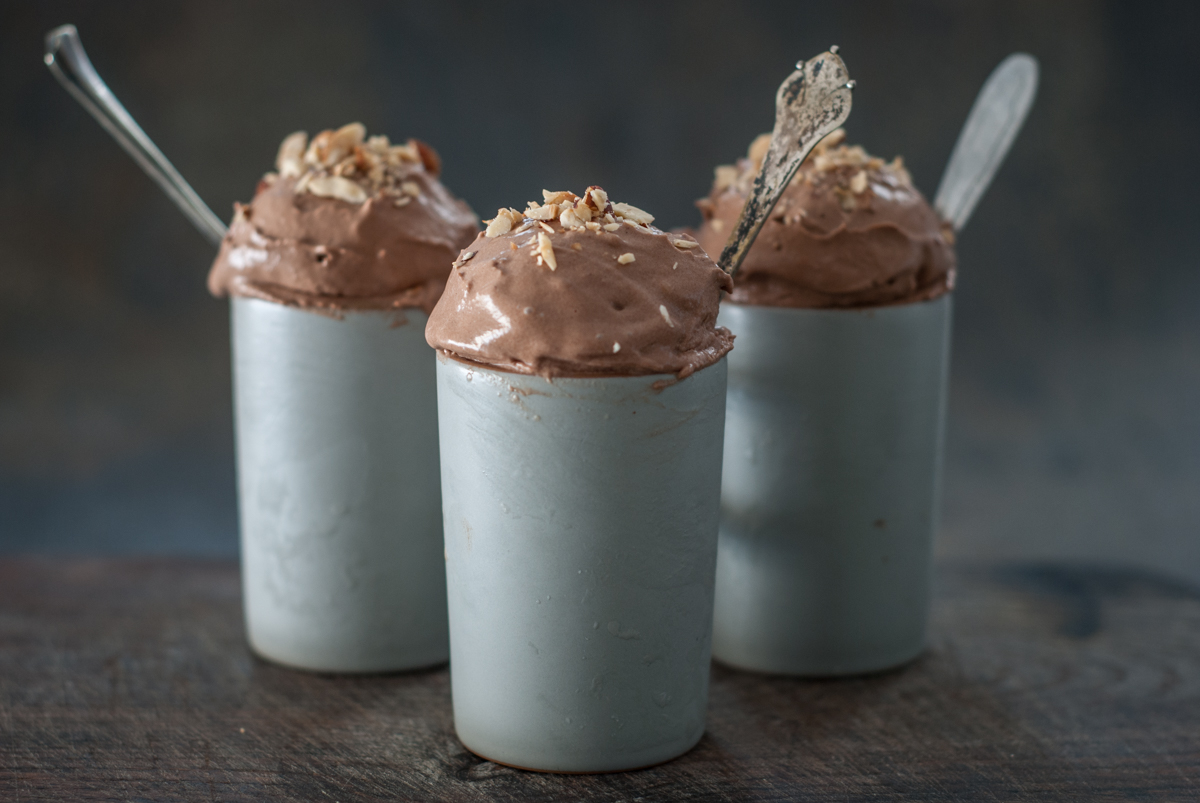 Place all of the ingredients in a blender, except for the hazelnuts. Slowly turn on blender until the mixture comes together. Increase the speed to medium/high and blend for 1-2 minutes to help dissolve the sugar and make everything nice and creamy. Pour into bowl and refrigerate for 3 hours or overnight.
