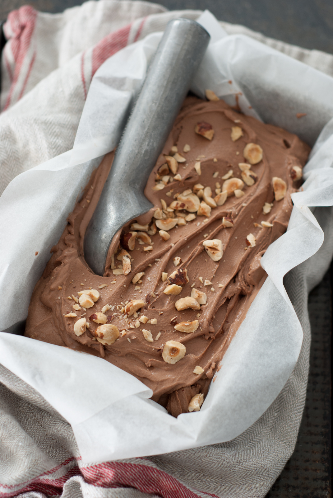 Vegan coconut chocolate ice cream studded with toasted hazelnuts.