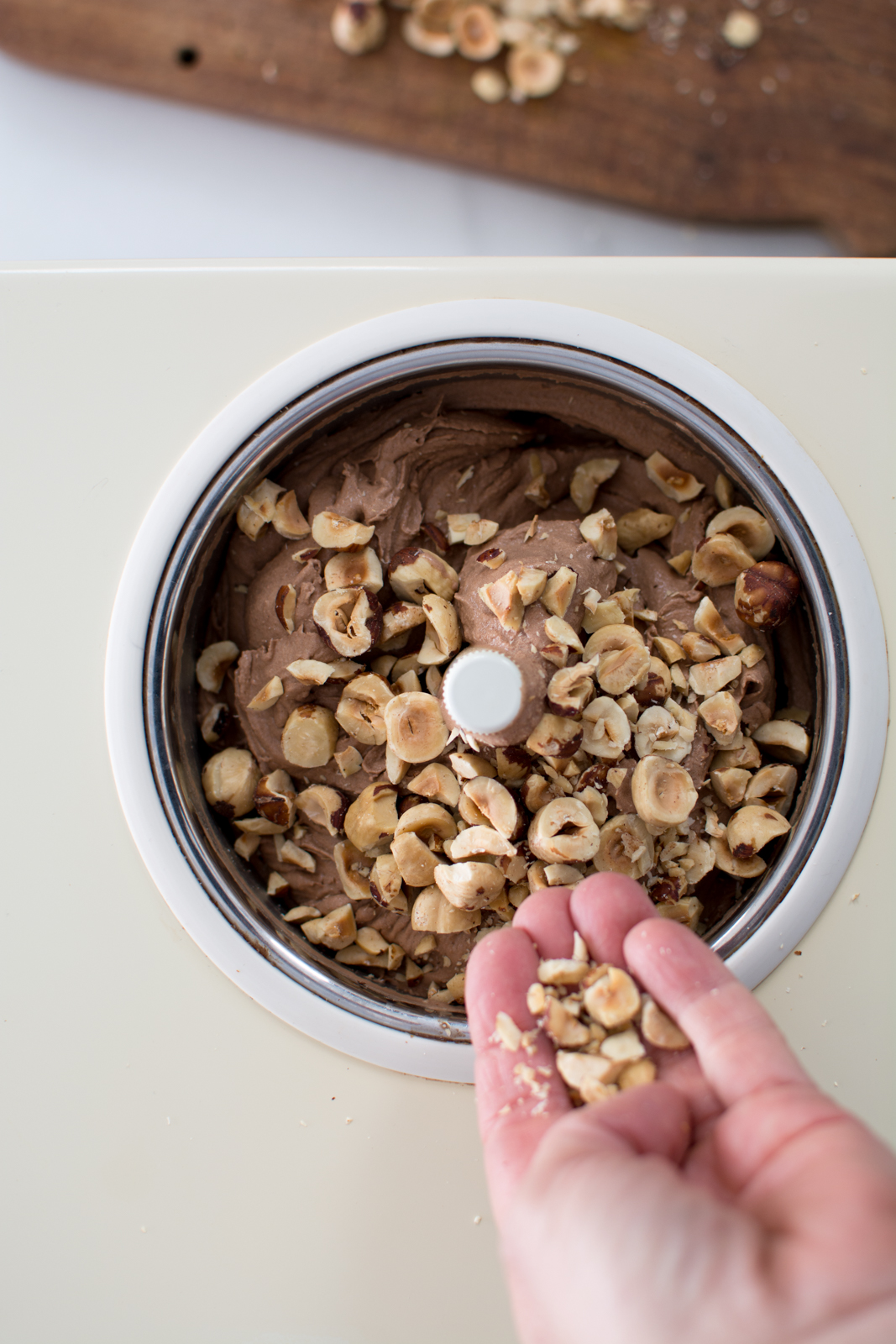 Add chopped hazelnuts. You can add more or less that the amount I use. Continue to run ice cream maker just until nuts are mixed in.