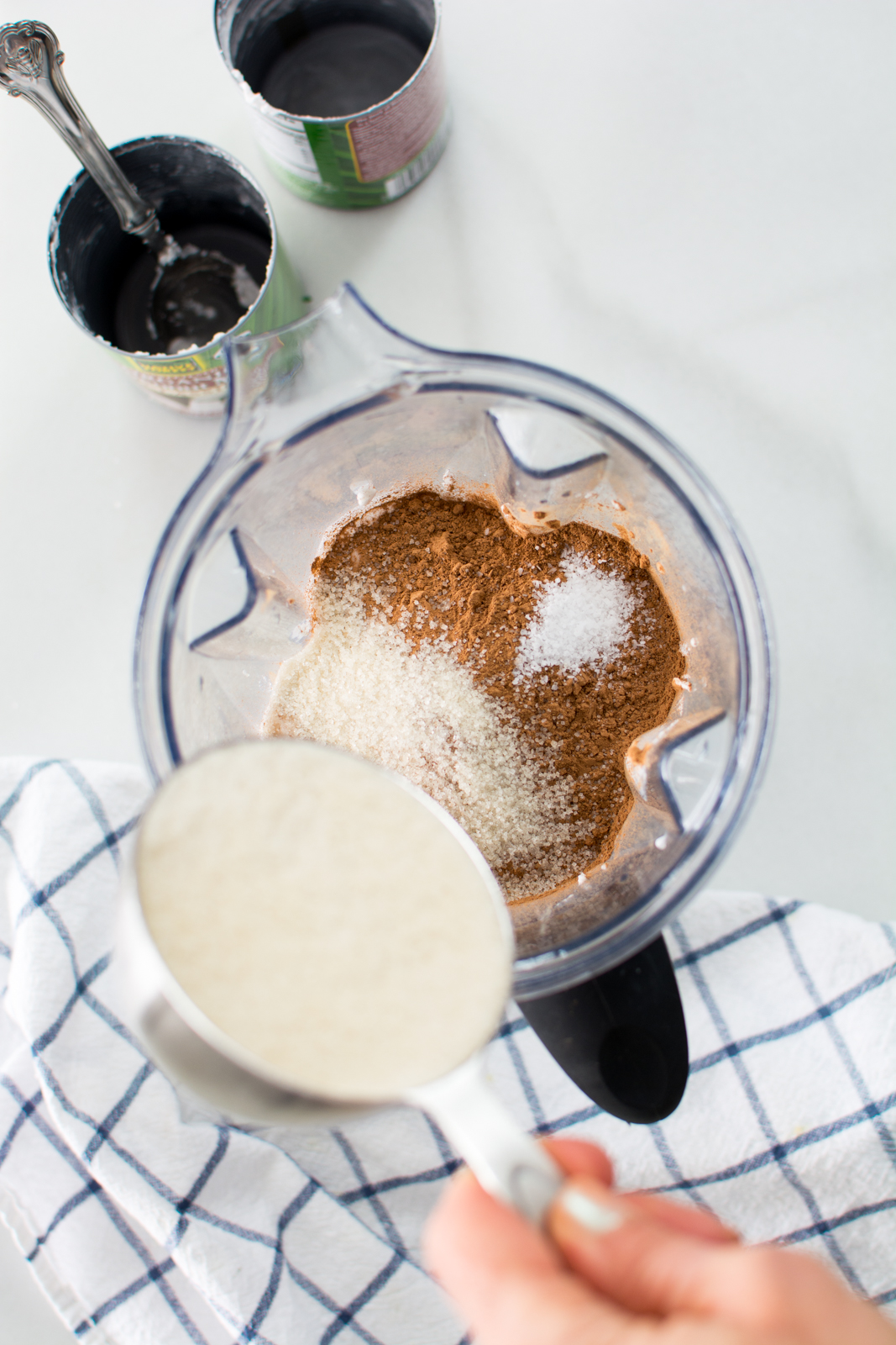 In a blender or a mixer add the coconut milk, cacao powder, cane sugar, salt, vanilla and agave.