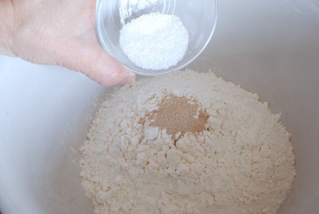 In a large mixing bowl mix the flour, yeast,