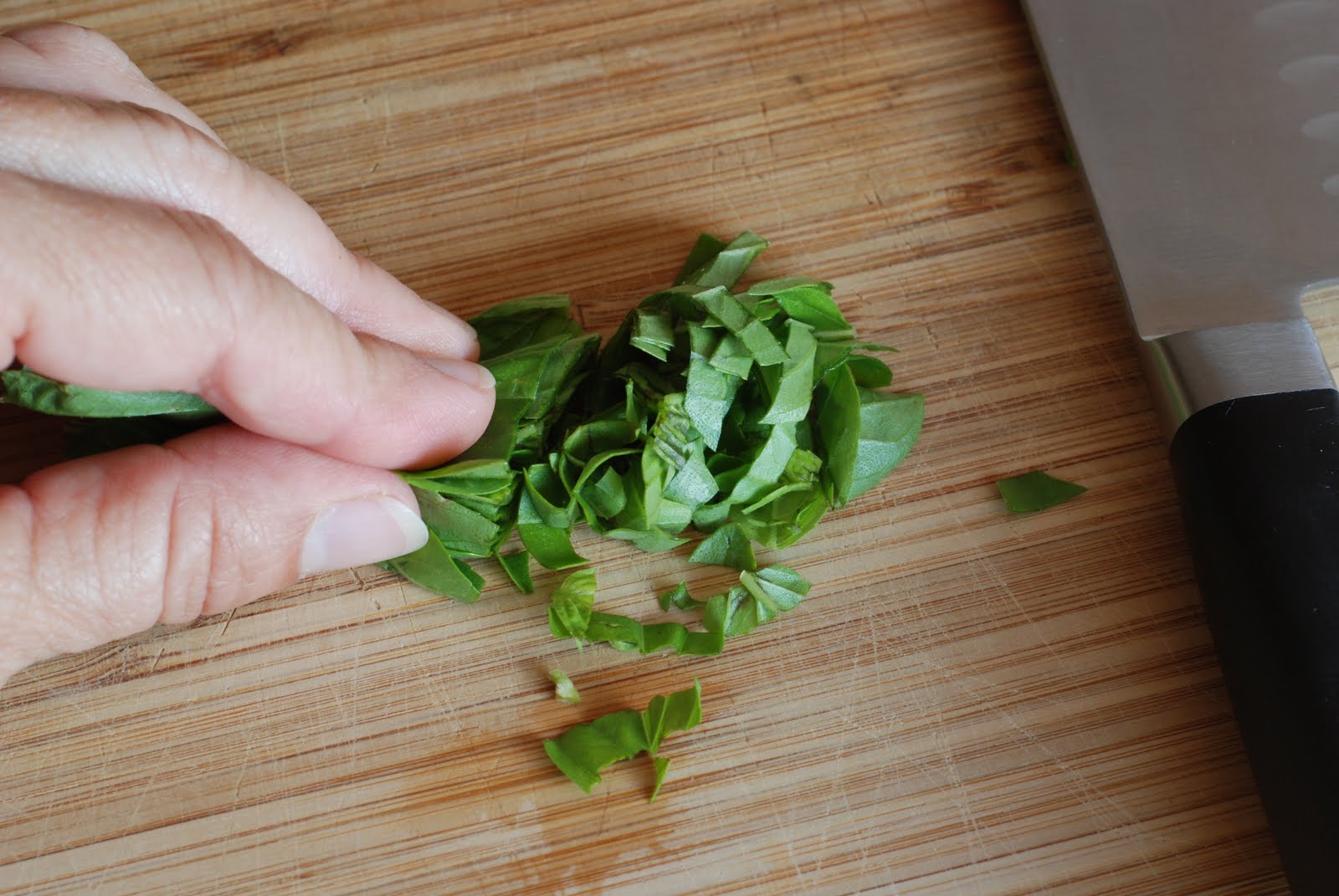 Stack the leaves on top of each other and roll them together a bit. Slice the basil. This is called a “chiffonade”. Set the basil aside until the tart comes out of the oven. When the tart is completely cooked with no juices visible, remove from the oven. Sprinkle with basil.