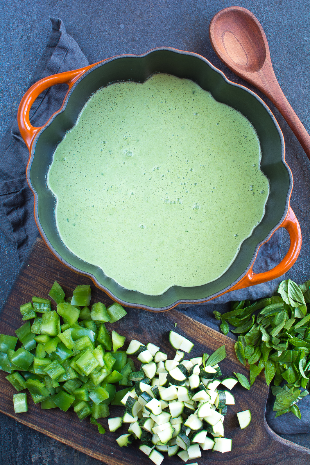 Puree 3-5 tablespoons of curry paste with coconut milk and spinach until smooth. Pour into a large pot and bring to a simmer. Add zucchini, green peppers, chicken, and basil. Bring to a low simmer for 7-10 minutes.
