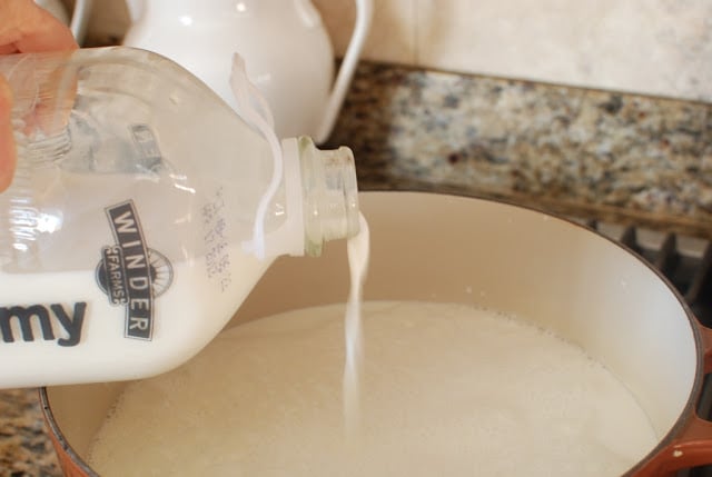 In a very large pot, pour in the gallon on milk. I’m using Winder Farms milk. I firmly believe in supporting local businesses and I know it’s fresh.