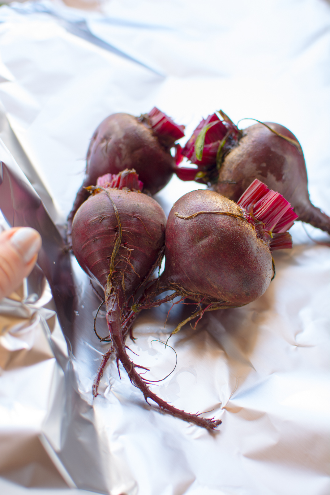 Preheat oven to 350F. Place beets on a large sheet of heavy aluminum foil.