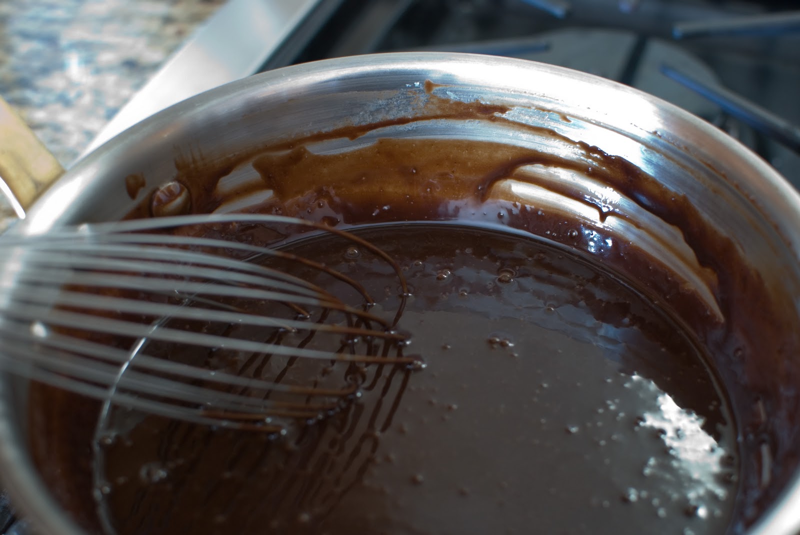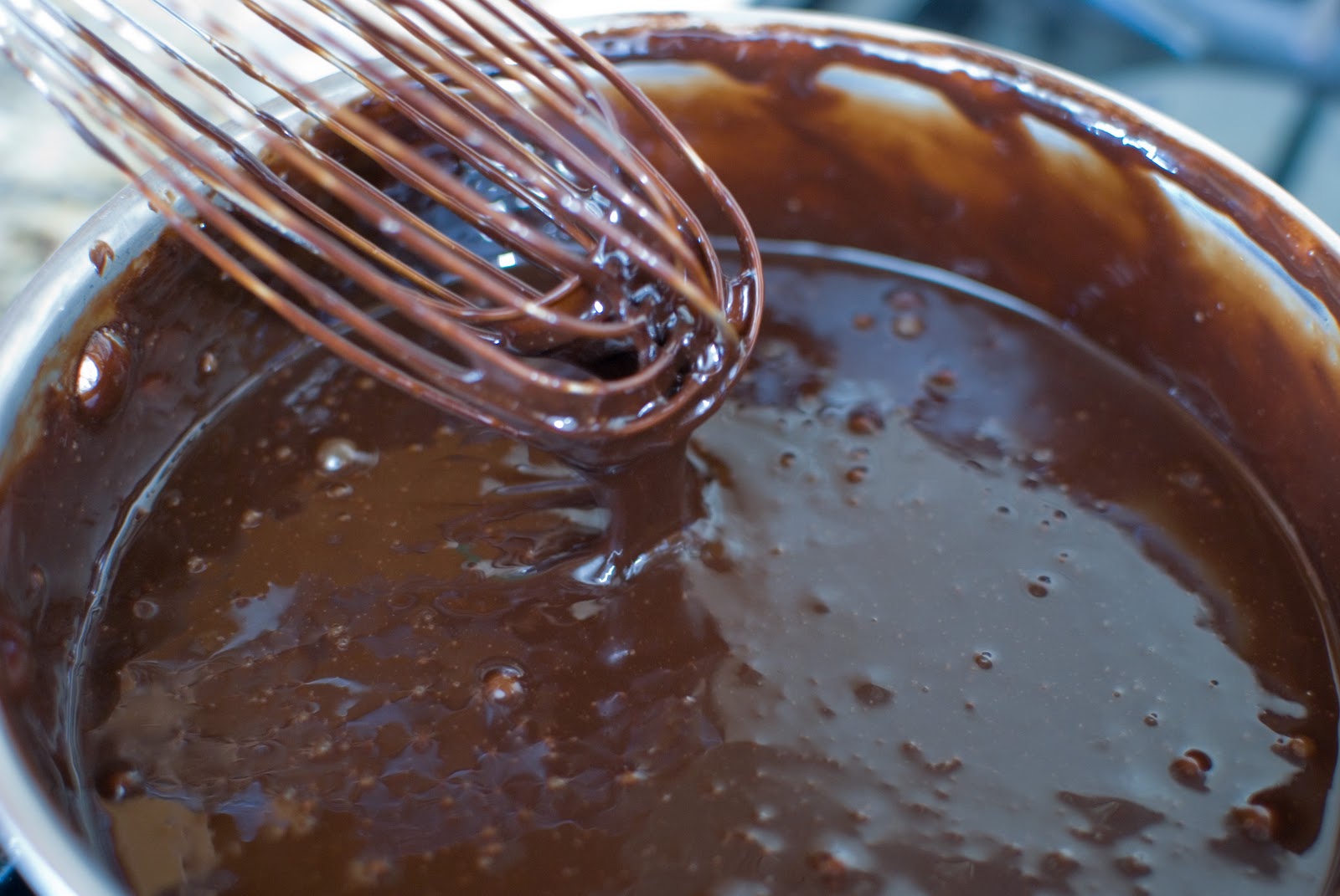 When the chocolate begins to melt, start whisking.