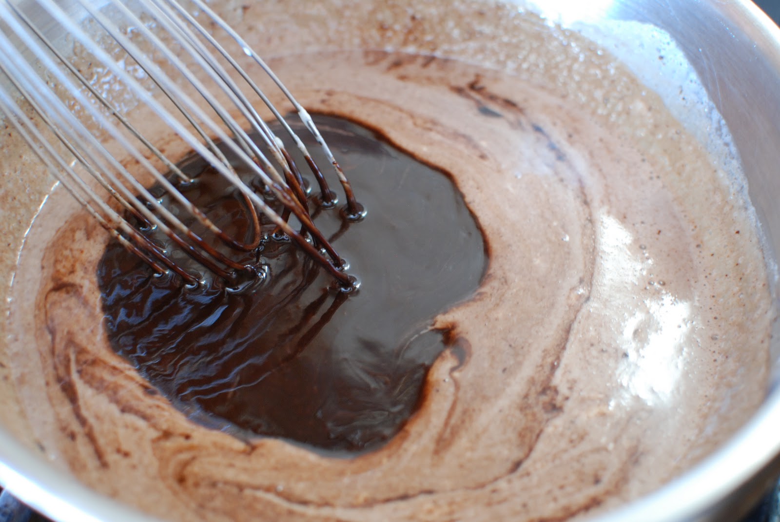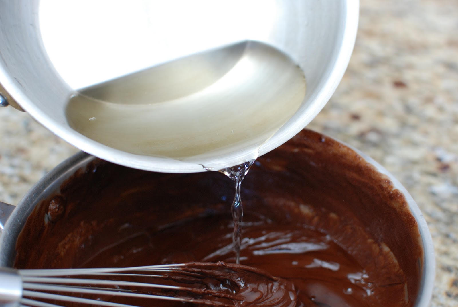 Immediately add the sugar/water mixture into the chocolate mixture.