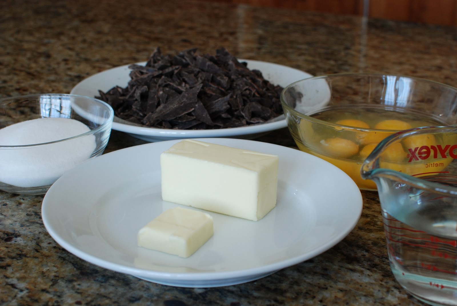 For the Black Beast you will need 18 ounces of chocolate chopped, unsalted butter, eggs, sugar and water.