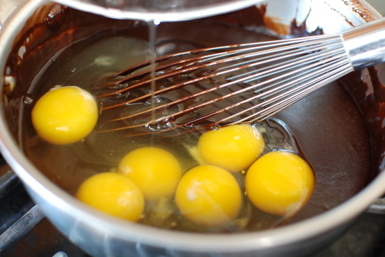 Add all of the eggs at once and begin to whisk vigorously.