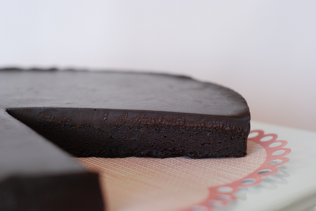Do you blame him. This is a rich flourless chocolate torte topped with chocolate ganache.