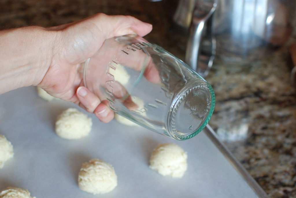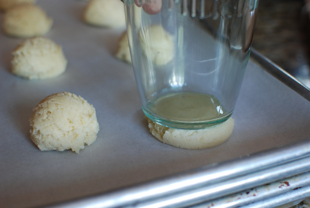 Drop dough by heaping tablespoons onto a baking sheet that has been lined with parchment paper. Dip the bottom of a glass into cold water the press dough to flatten slightly.