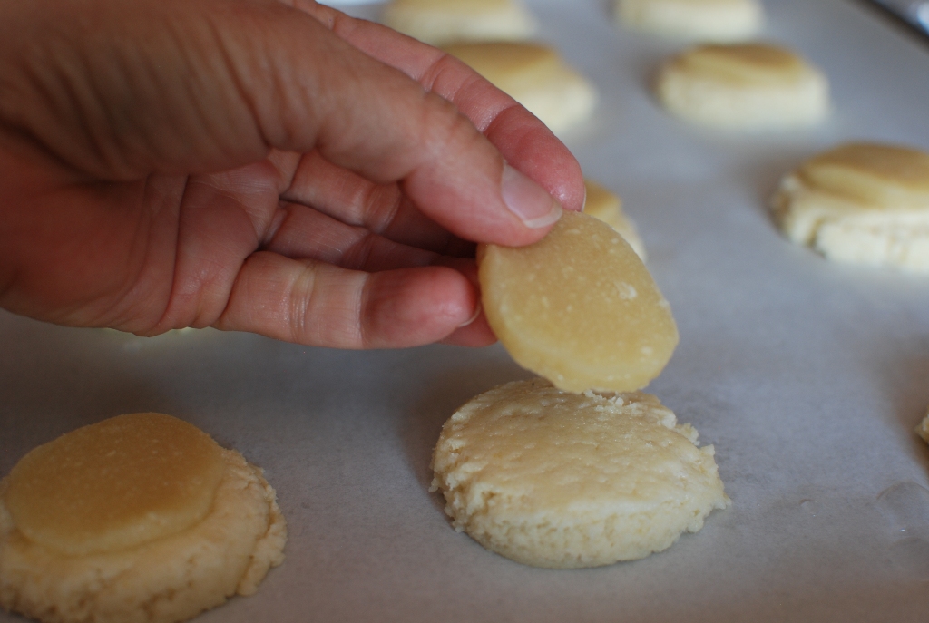 Top each flattened cookie with a slice of almond paste. Bake for 12-14 minutes or until just barely starting to turn golden around the edges.