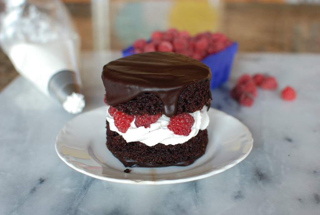 To assemble: Place an un-glazed cake on a serving plate and top with a large dollop of whipped cream. Top with fresh raspberries. Top with the chocolate glazed cake round. Add another dollop of whipped cream and garnish with more raspberries. Refrigerate until ready to serve. Makes 7 double layer cakes.