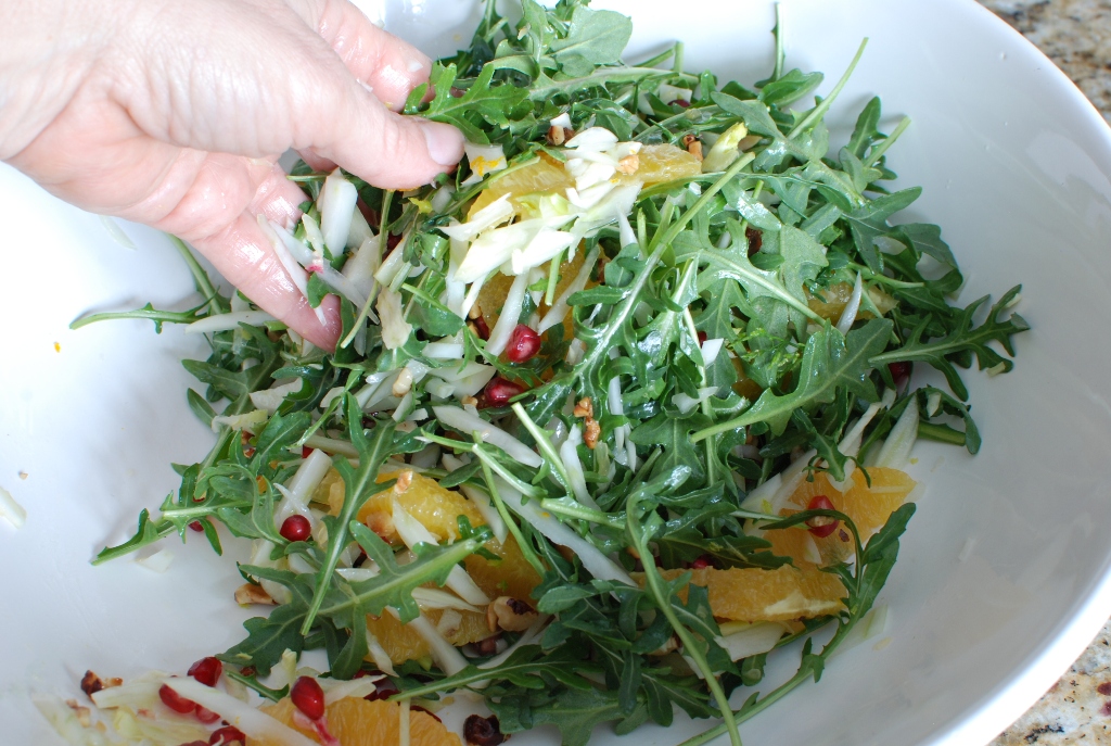 The best way to toss a salad is with your hands. I feel like I can be more gentle with the salad. I don’t want the orange segments to break apart.