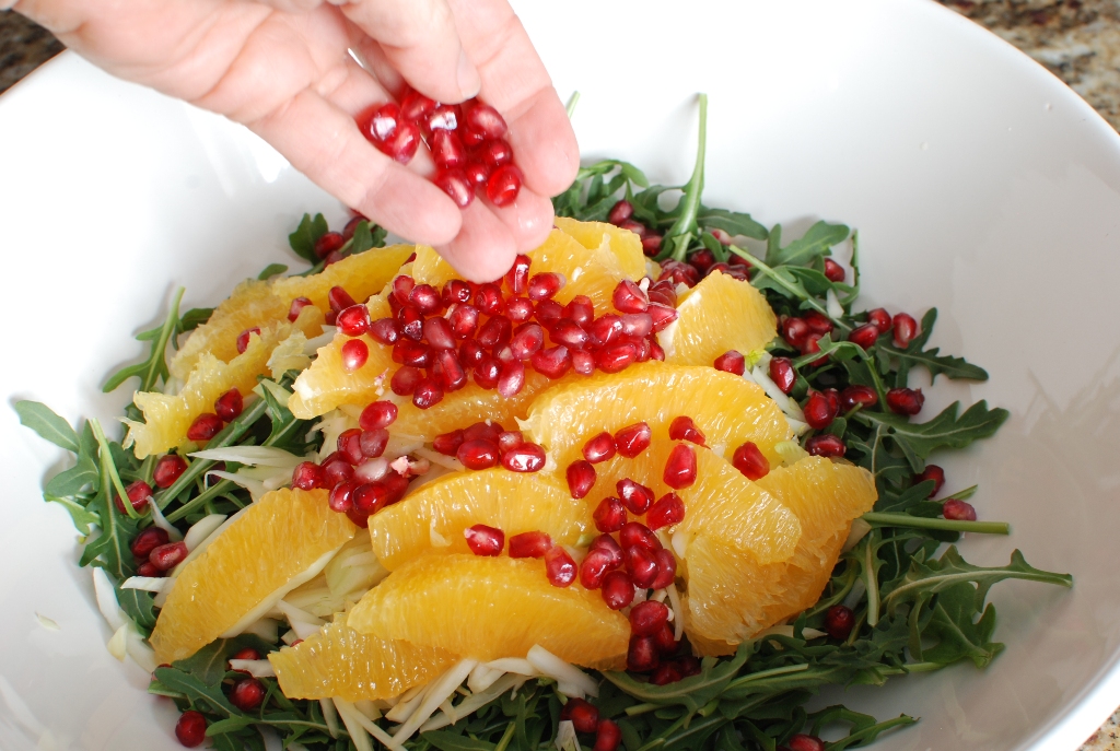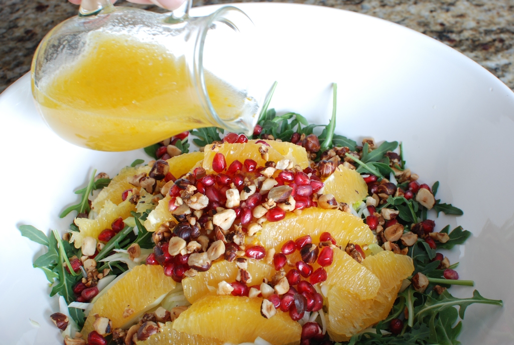 Orange Fennel Arugula Salad with Pomegranates and candied Hazelnuts