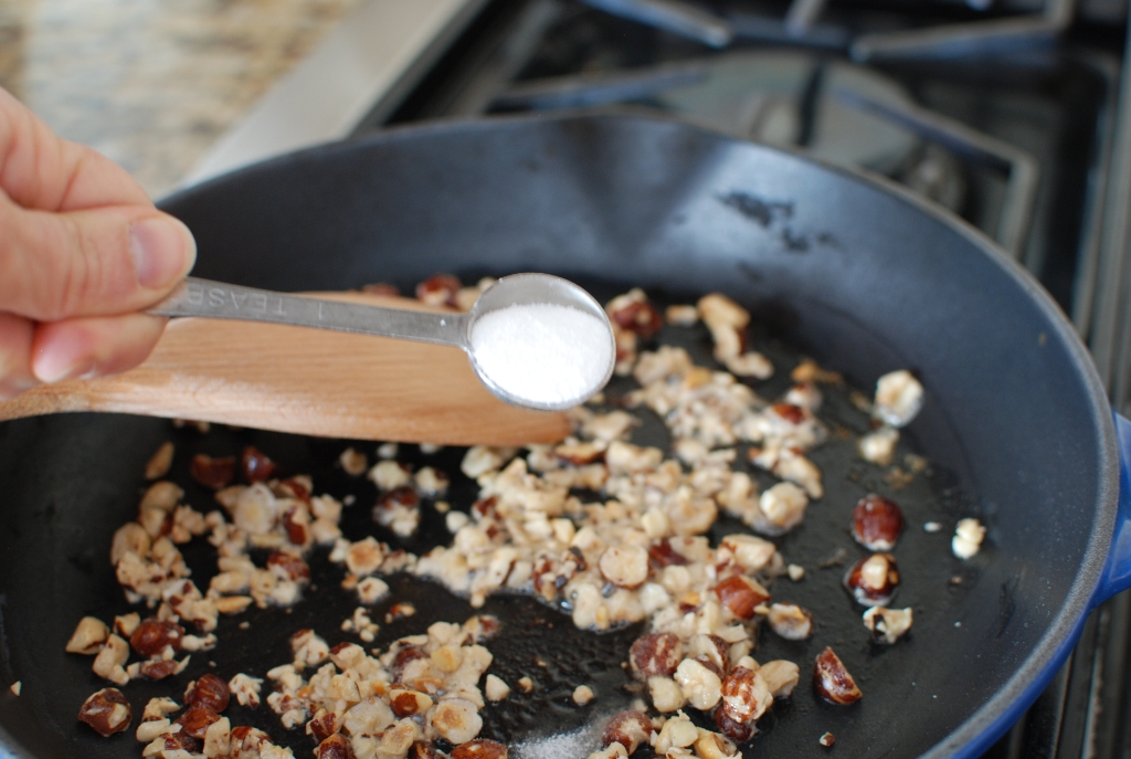 In a small skillet melt butter and add hazelnuts, sugar, and pinch of salt. Cook over medium heat stirring continually until hazelnuts begin to brown. Remove from heat and pour hazelnuts onto a plate lined with a paper towel. Set aside to cool.