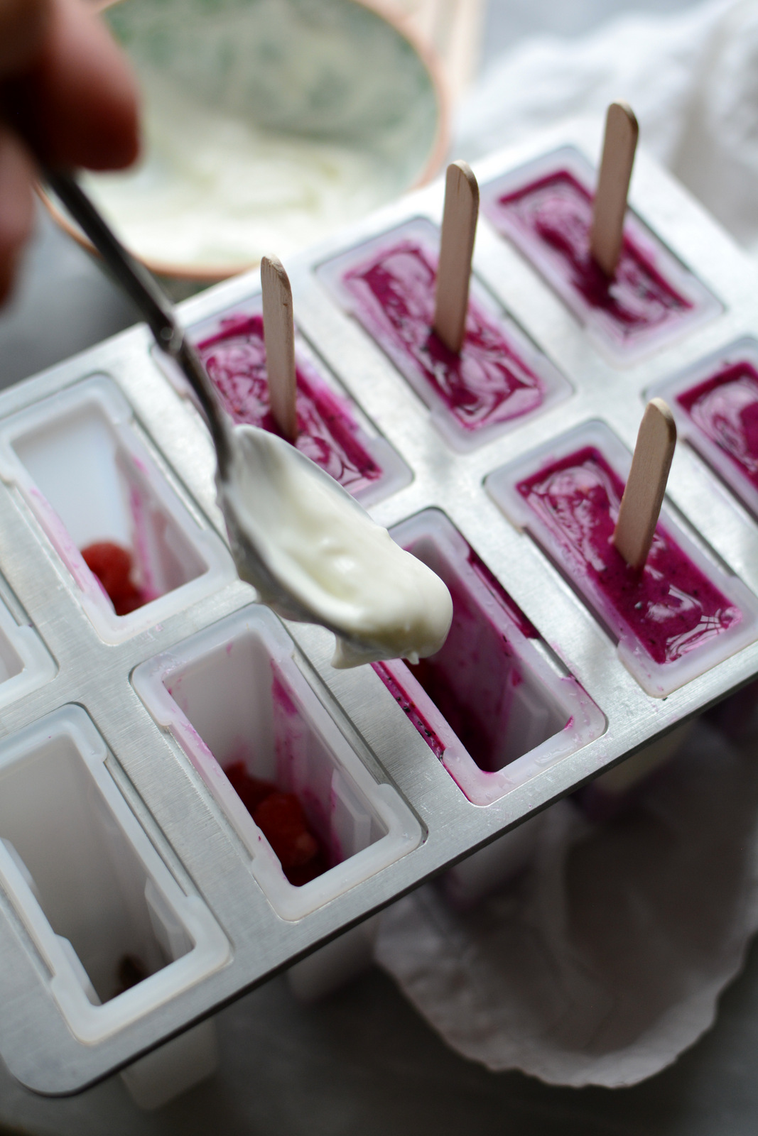 Blend in a blender until smooth. Layer into molds beginning and ending with pitaya/fruit blend. Layering with pitaya/berries/yogurt, repeat. Freeze molds for 3 hours or overnight.