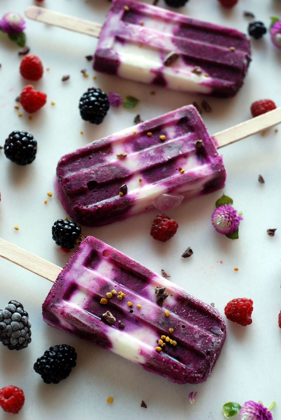 I like to layer my pops with pitaya blend and Greek Yogurt. You can be creative and make the pops to your liking. My liking is pitaya/yogurt/raspberries, cocoa nibs and a bit of bee pollen.