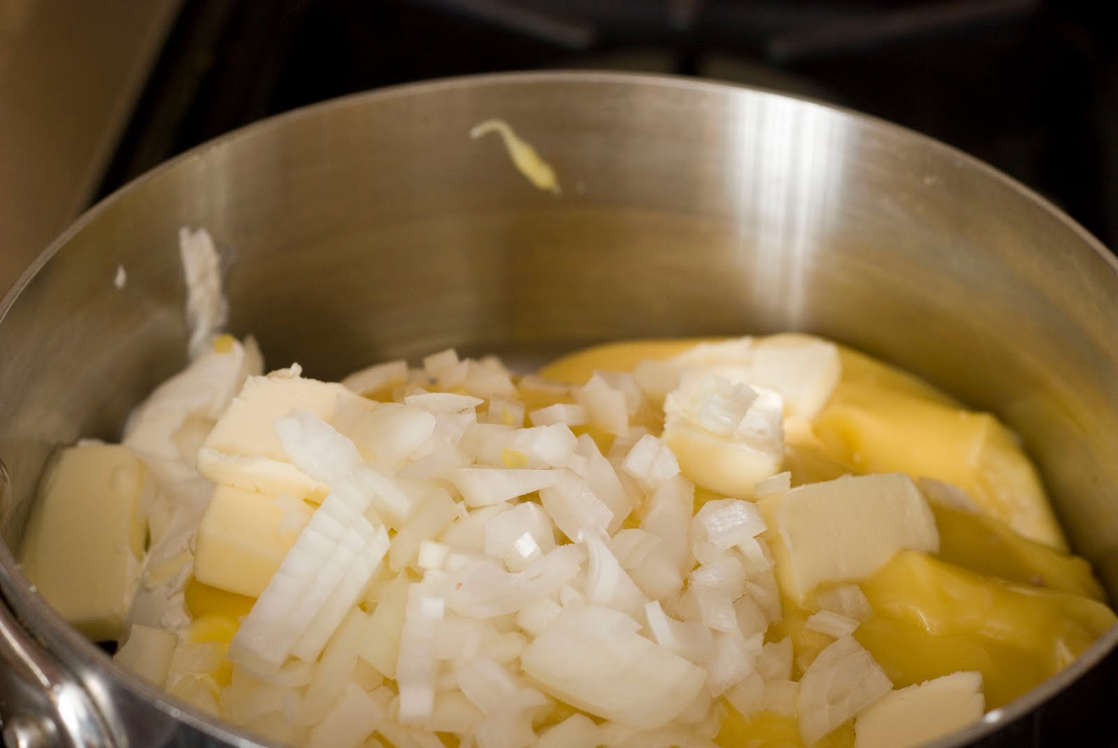In a medium-saucepan mix and heat the butter, soup, sour cream, onion, and salt. Cook until the butter is melted and the sauce is smooth. Remove from the heat and stir in the shredded cheese. The cheese does not have to be completely melted.