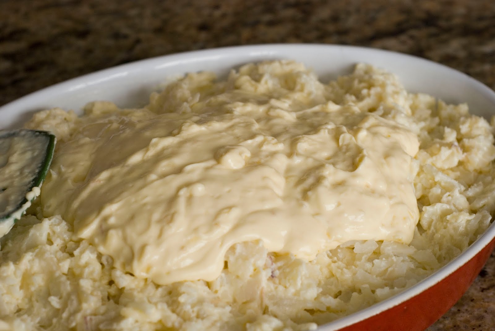 Stir 2/3 of the mixture into the cooled and shredded potatoes. Gently stir to thoroughly coat the potatoes. Pour the potato mixture into a buttered 9 x 13-inch baking dish. Spread with remaining sauce on top then sprinkle with cornflake mixture.