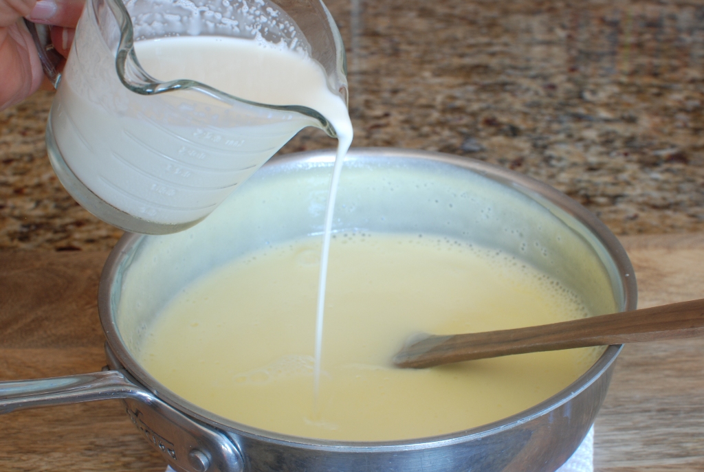 Add half of the warm milk to the egg mixture and stir until blended. Return the new egg mixture to the sauce pan with remaining milk.