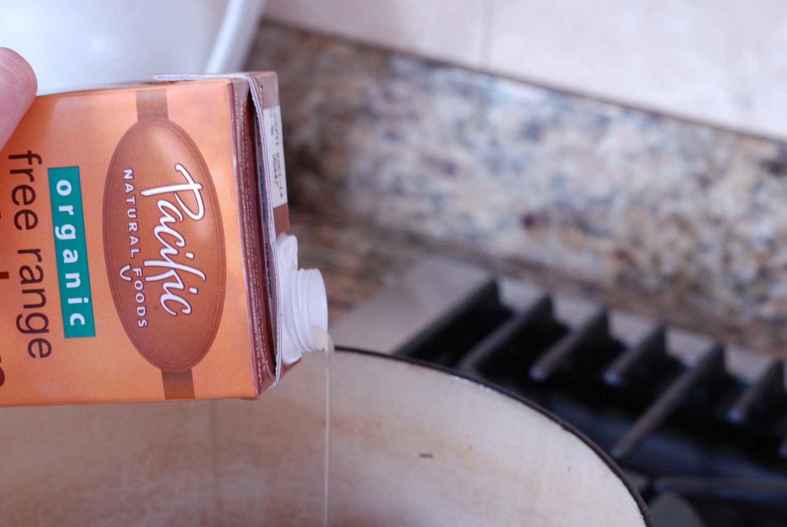 First of all you need to get your chicken stock hot. Pour 8 cups into a large pot and bring to a simmer. After the broth comes to a simmer, reduce to low. You want to keep the stock hot at all times during the cooking process.