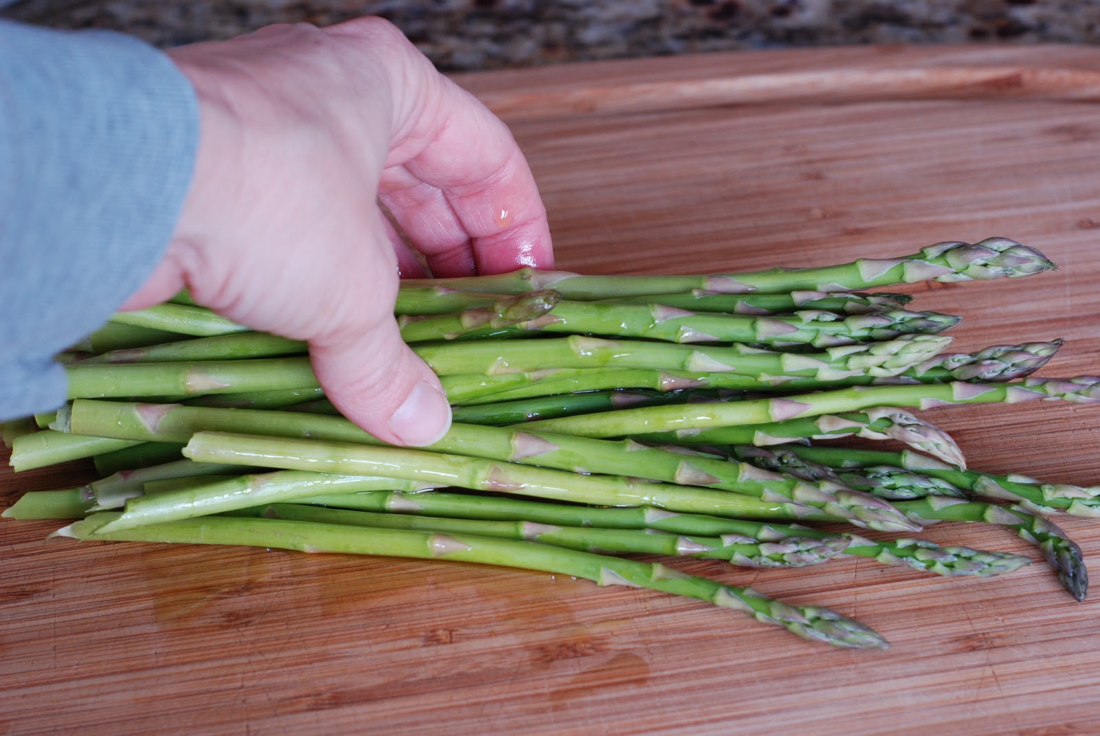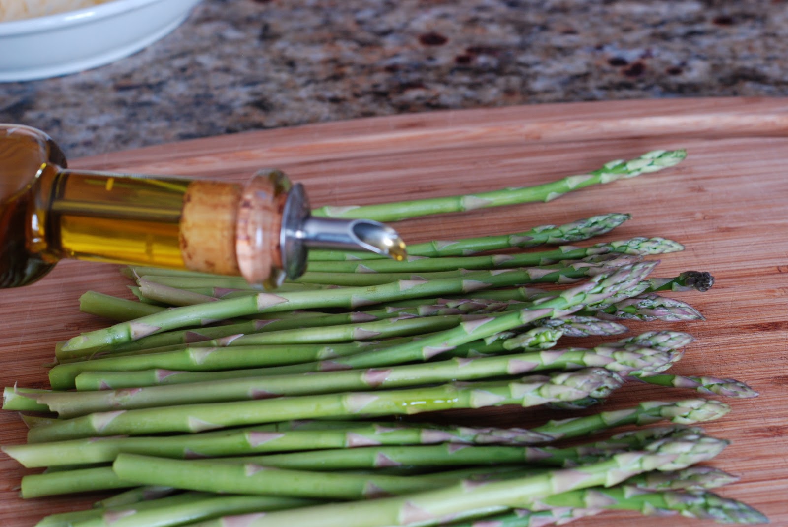 I broke off the ends and now I’m drizzling a little extra virgin olive oil on the asparagus.