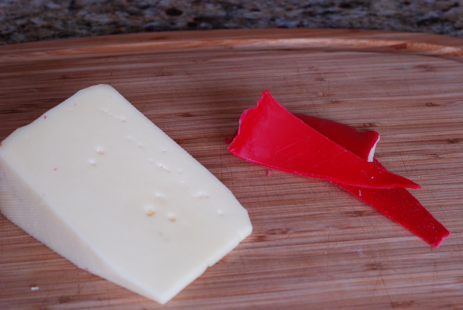 Remove the red wax from the outside of the fontina cheese and discard the red stuff.