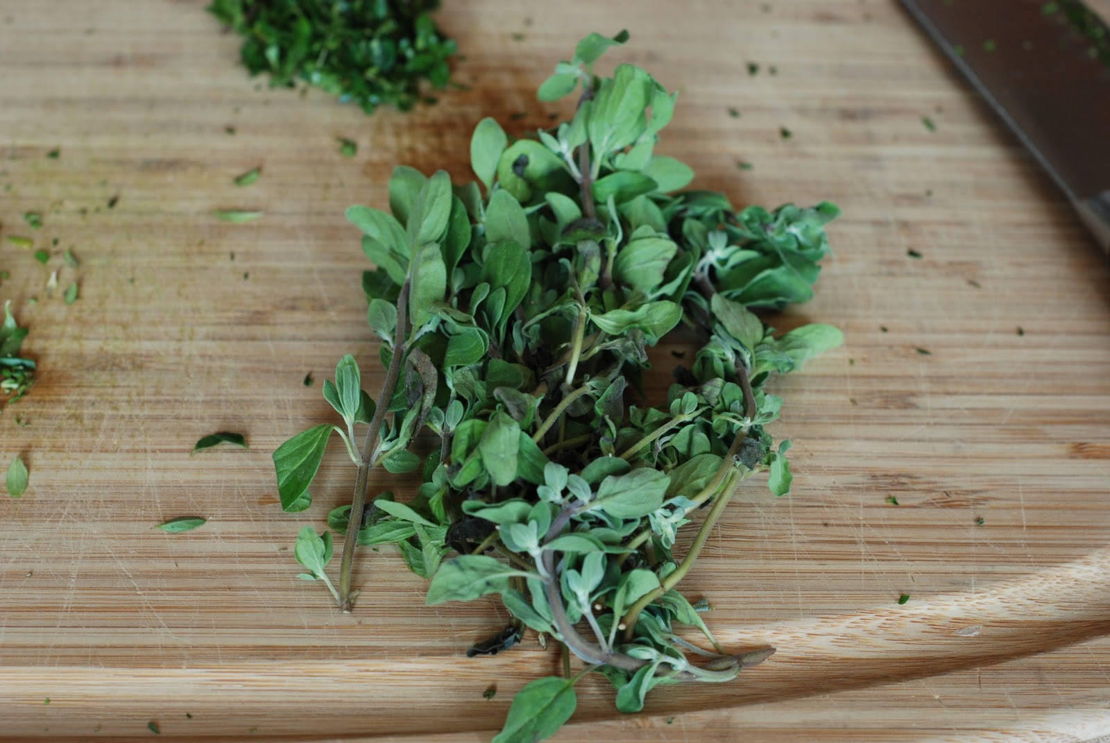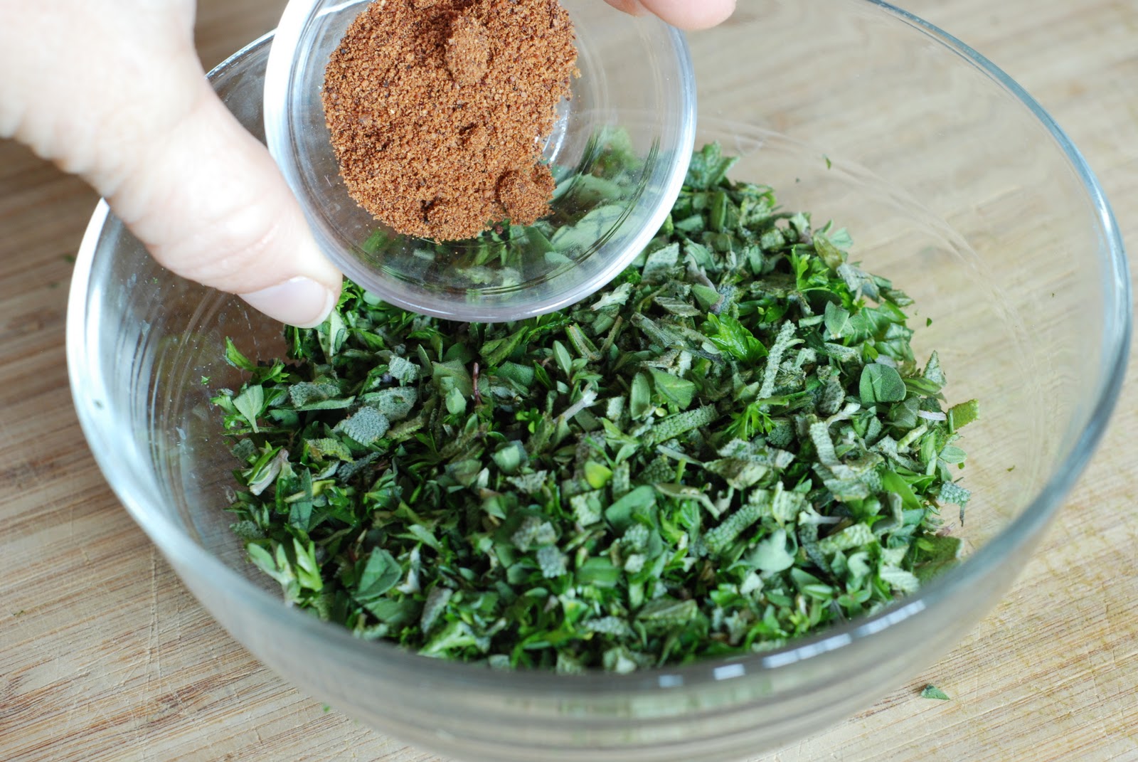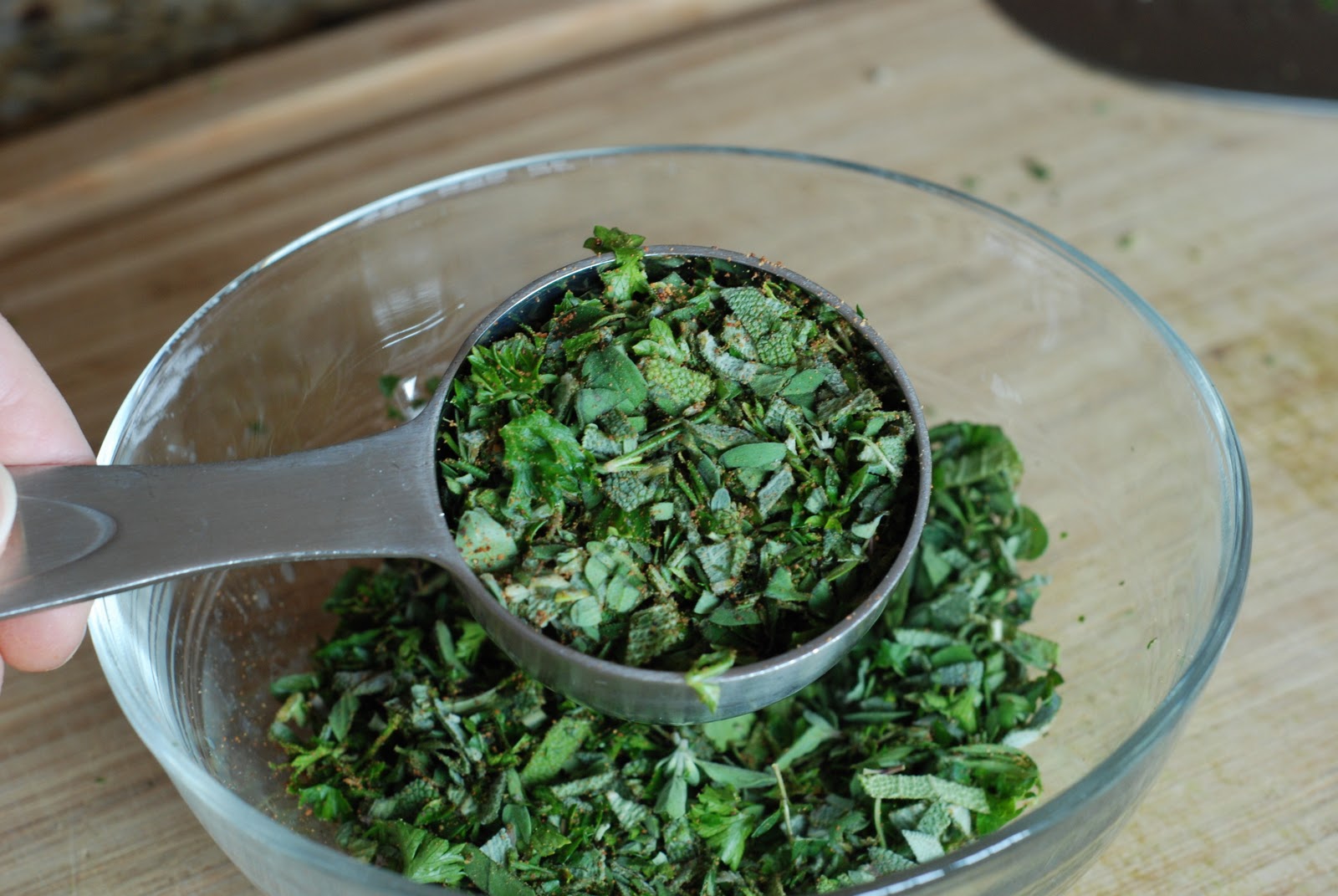 Chop all of the herbs quite fine. Let’s throw in some ground nutmeg as well.