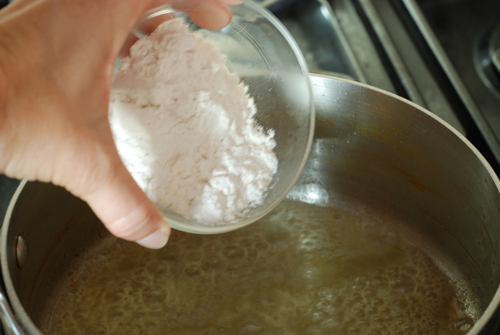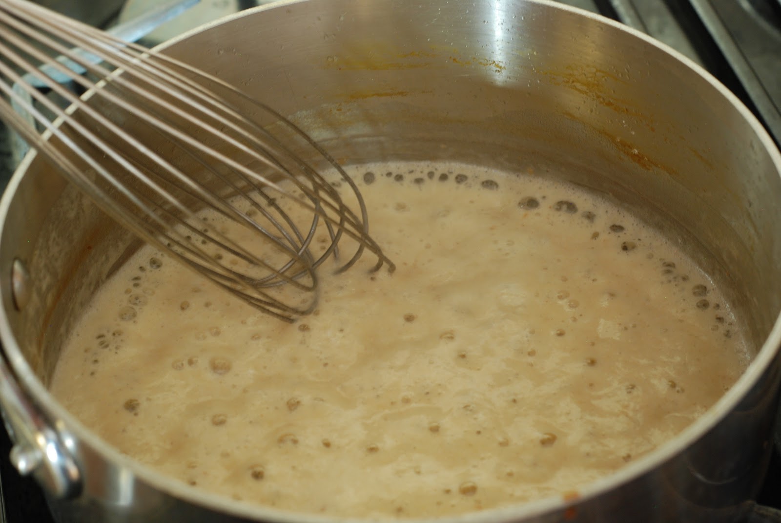 Carefully pour in the reduced stock mixture. Whisk and cook until beginning to thicken.
