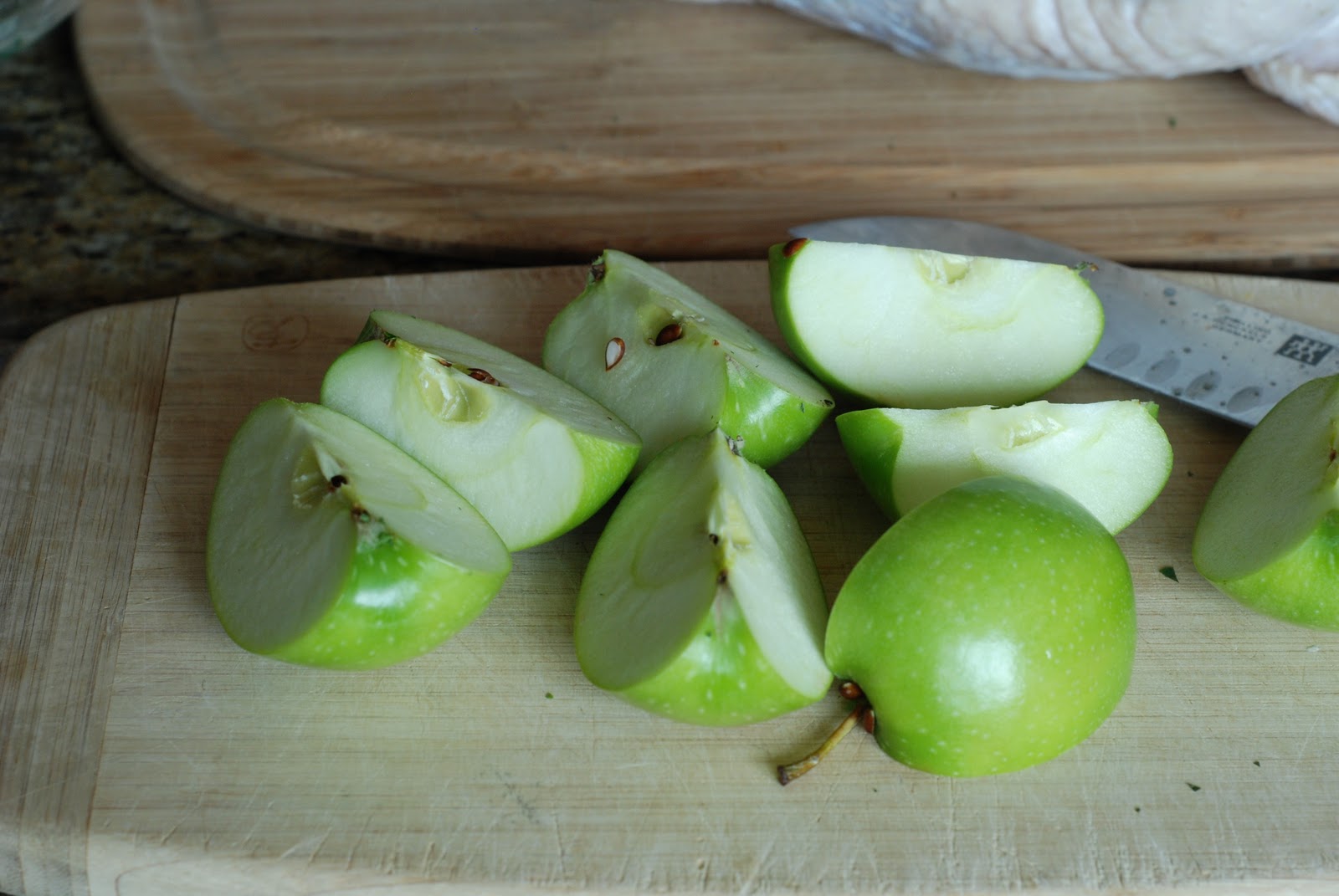 You will need 2 Granny Smith apples, 2 onions, Parsley, Sage, Rosemary and Thyme…go ahead sing it! I did while picking the herbs from my garden. Thank goodness I didn’t have to brush snow off of them. They are still alive and green. That will only last a few more days I’m afraid.