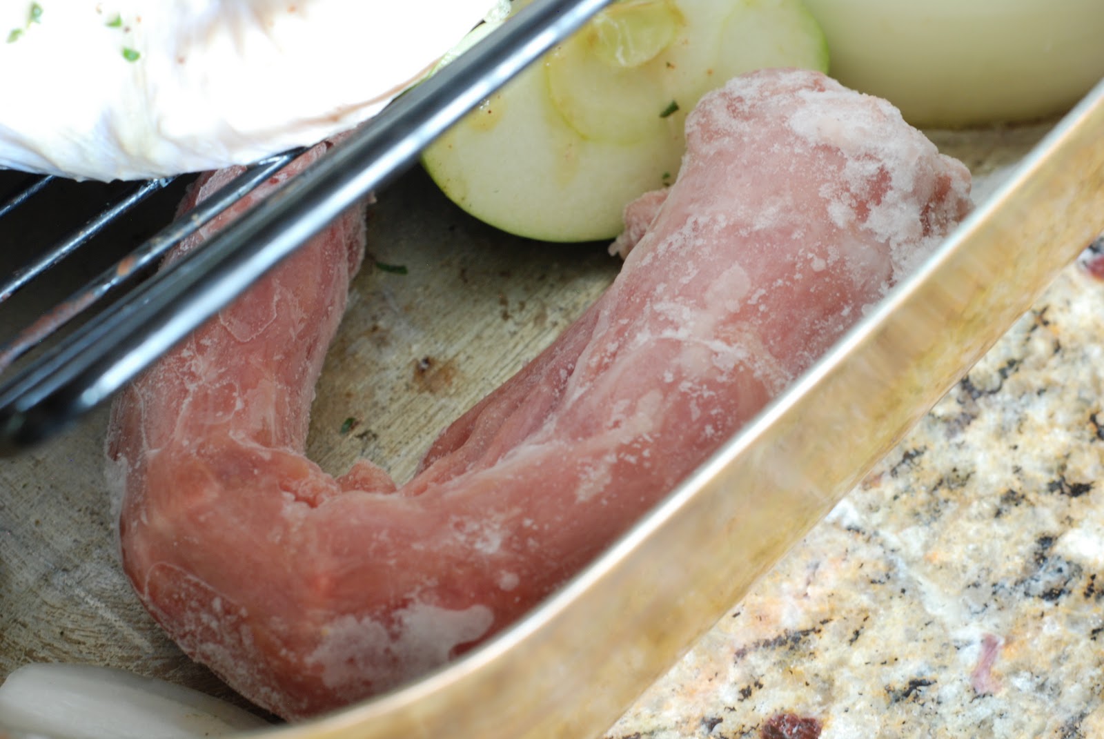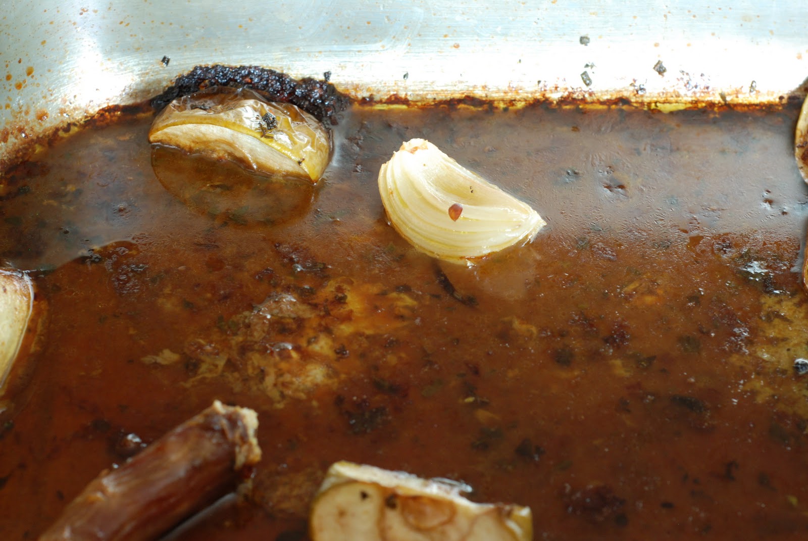 Look at all the brown goodness left in the bottom of the pan. Remove the turkey neck, apples and onions. discard them.