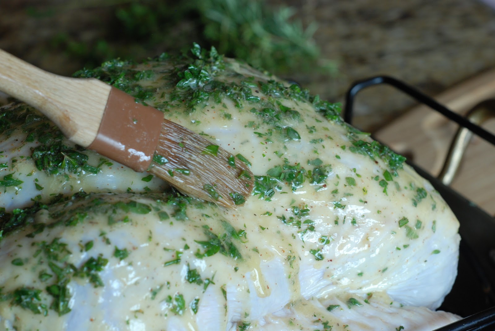 Brush the outsides of the turkey with the melted butter and herb mixture.