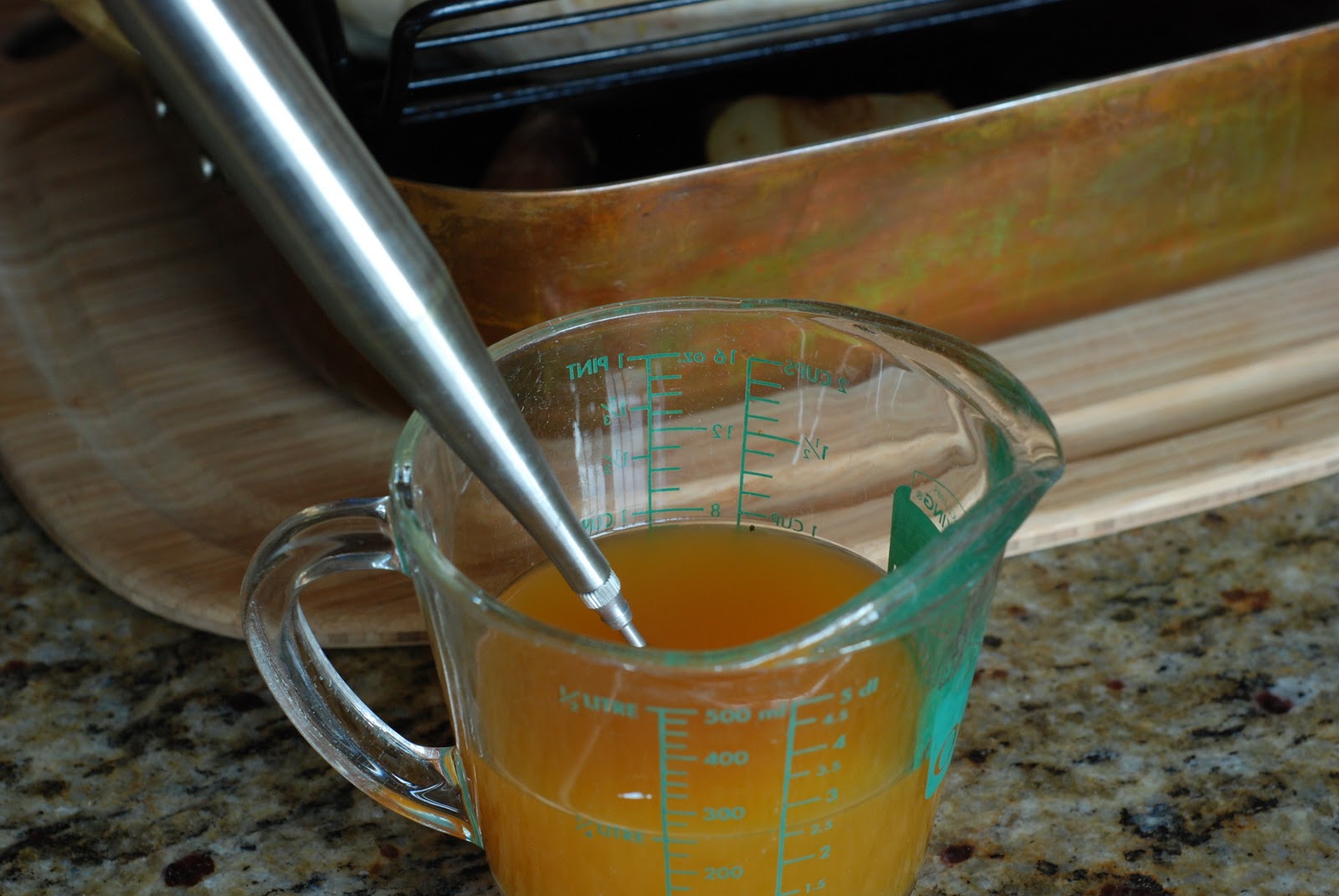 Let’s baste the turkey. You will need about 1-2 cups of turkey or chicken stock and a baster. If you don’t have a baster, just use a big spoon, but don’t burn yourself.