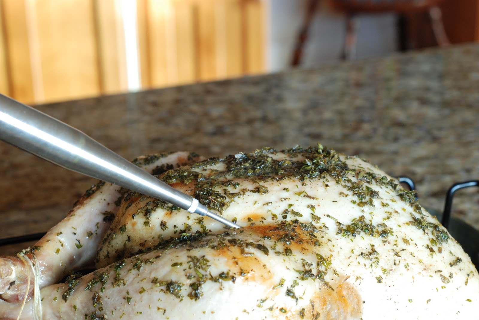 With the injector attachment I am squeezing some of the stock under the skin. This should help keep the turkey moist and give it more fabulous flavor.