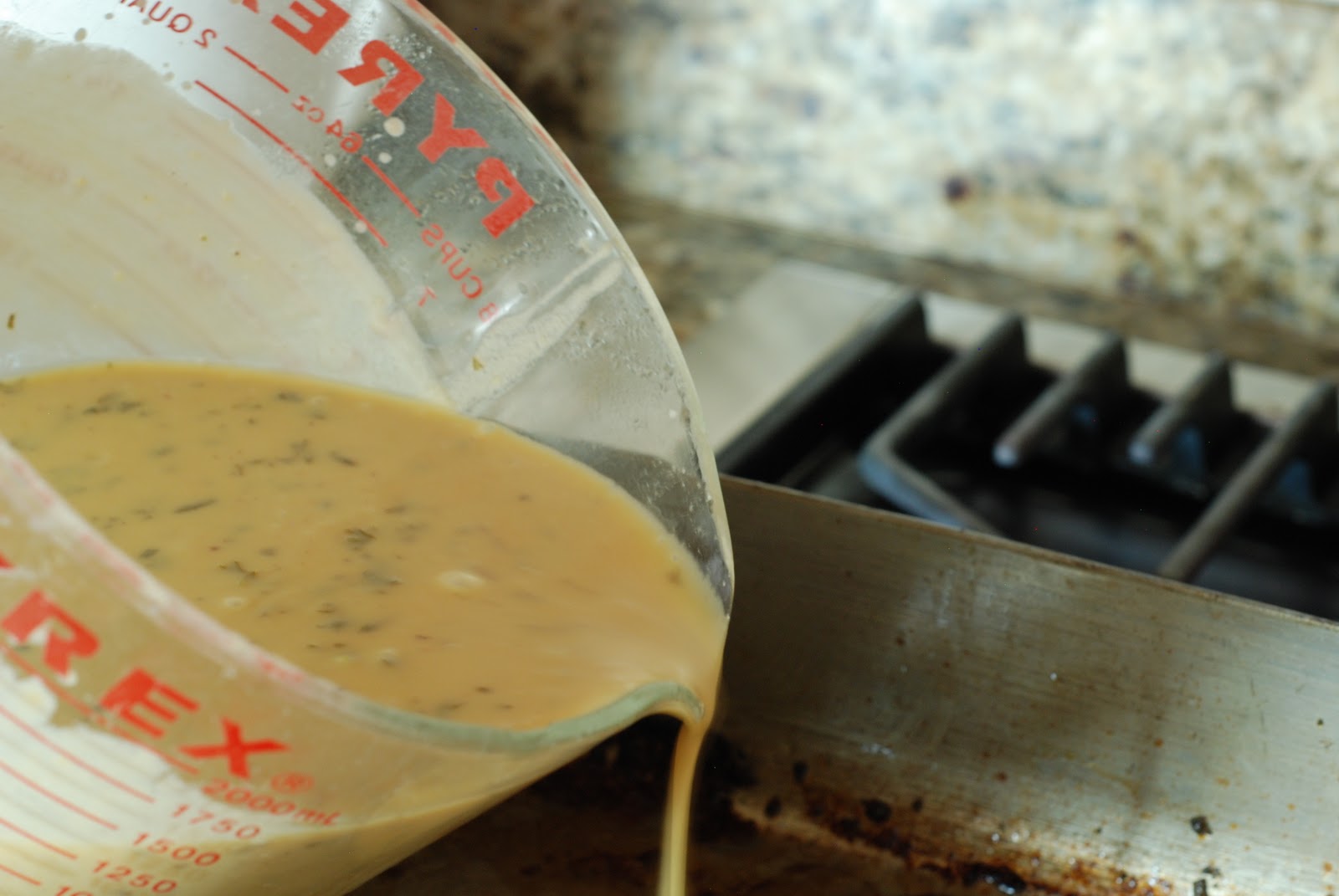Pour the remaining pan drippings into a bowl or a fat separator. This is an awesome invention. The fat rises to the top then I just pour out the beautiful brown stuff out from the bottom and into my pan for flavor without the fat.