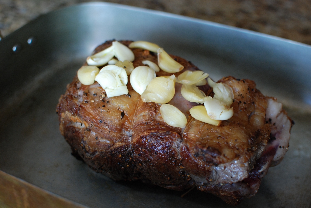 Place the meat in a roasting pan with the ribs down to serve as a rack. You can also use a rack if you prefer.