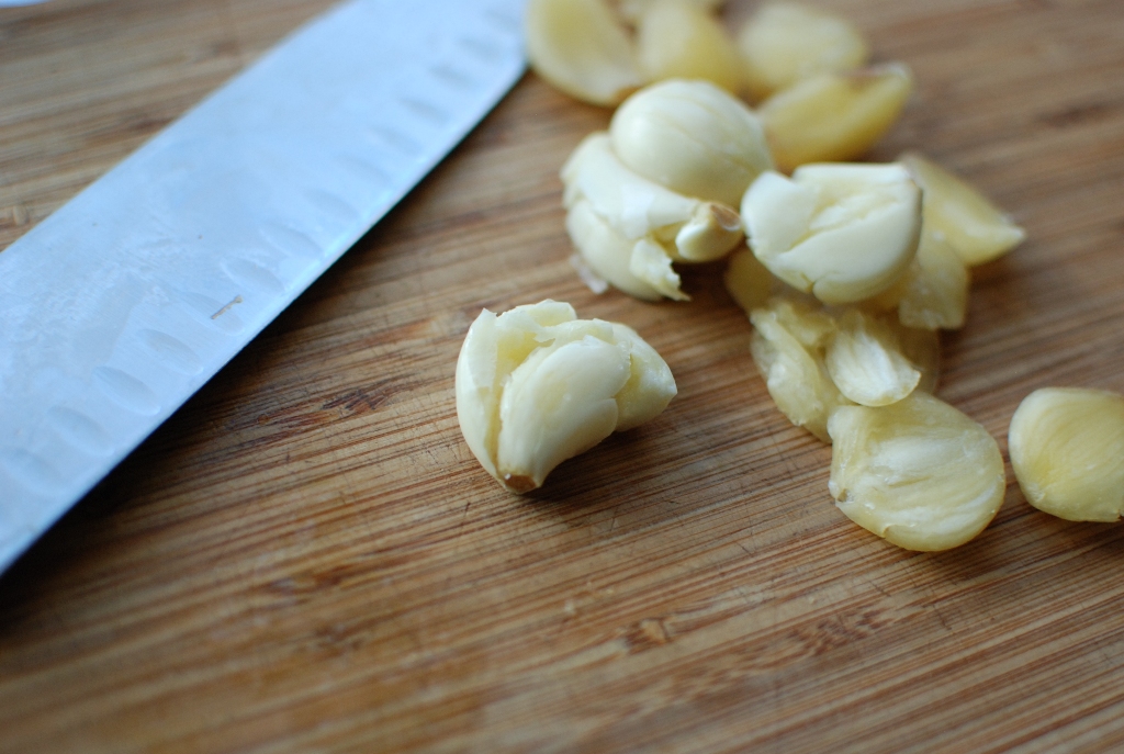 Smash 10 cloves garlic with a knife…or whatever it is you use to smash garlic.