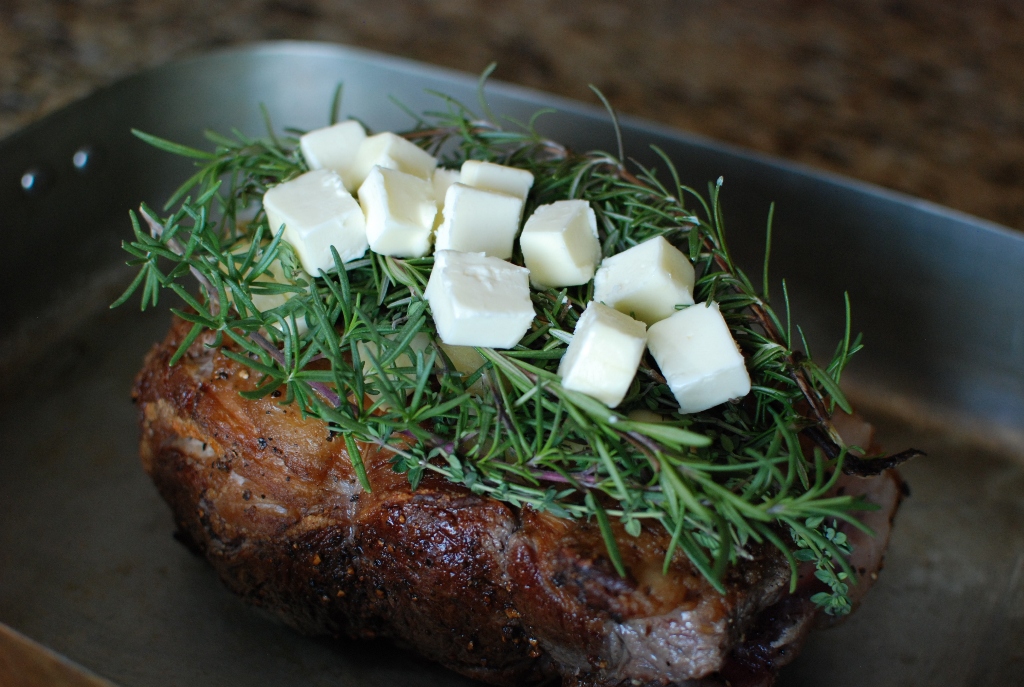 You will need a 3-bone roast (about 6 lbs), 3 tablespoons of fleur de sel or other flaky sea salt (kosher works), 1 1/2 tablespoons coarsely cracked pepper, 1 tablespoon of olive oil, 8-10 sprigs fresh rosemary, 8-10 sprigs, fresh thyme, 10 medium cloves garlic (smashed), 3 tablespoons unsalted butter, cut into 1/2-inch cubes.
