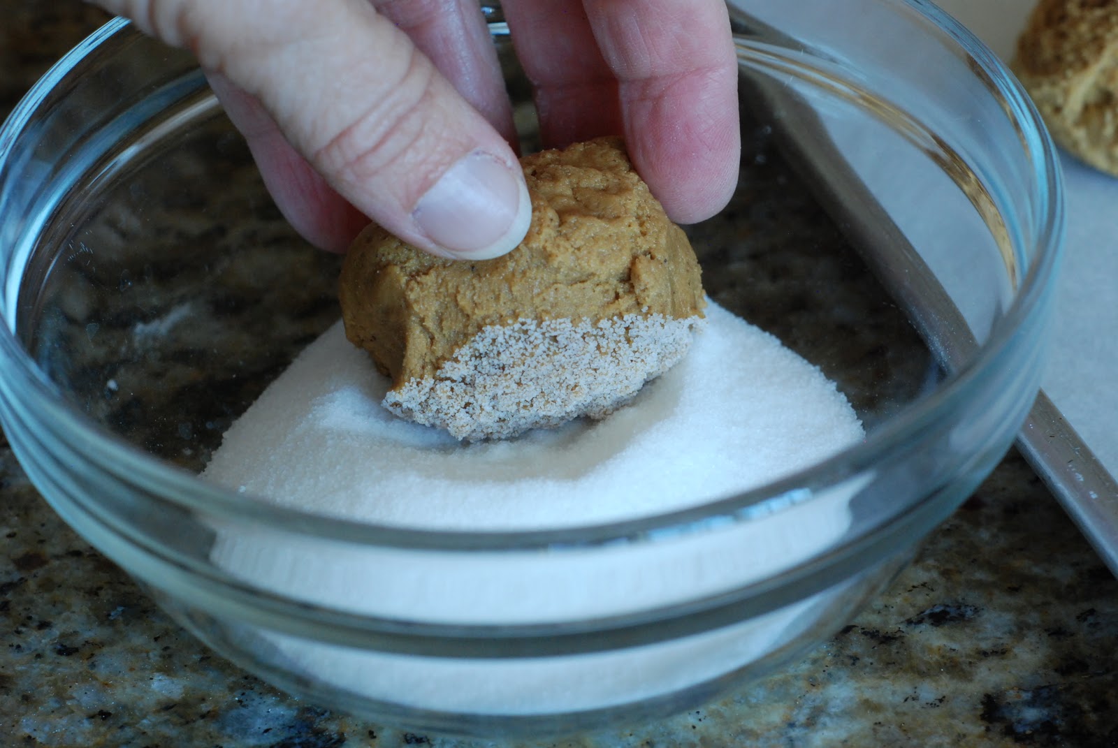 After the balls are formed roll each ball of dough into sugar. You will need about 1/4 cup of granulated sugar.