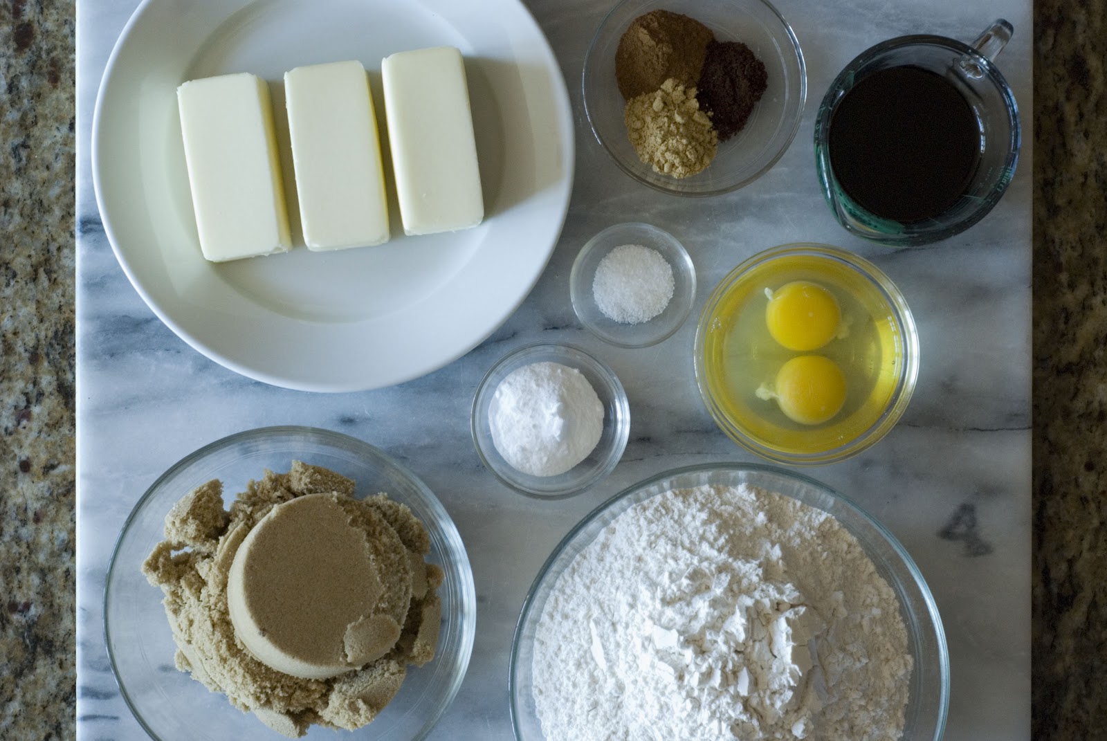 Ingredients: Butter, brown sugar, eggs, molasses, all-purpose flour, salt, baking soda, cinnamon, ground ginger and ground cloves.