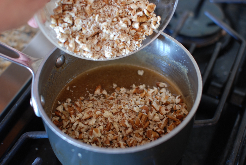 Meanwhile, in a small sauce pan add the brown sugar, mustard, honey and ground cloves. Cook the sauce until it begins to bubble and the brown sugar begins to dissolve. Stir in chopped pecans. Set aside.