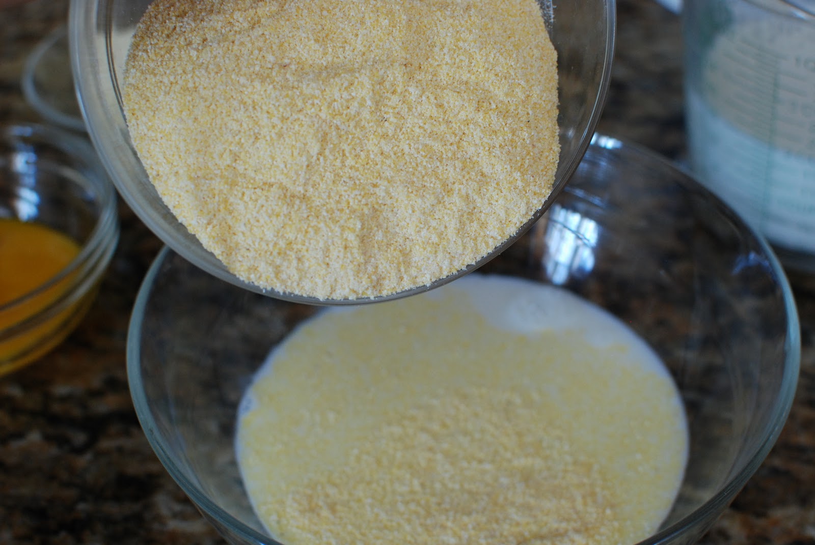 Pour 1 cup of the milk into a small mixing bowl. Add the cornmeal.