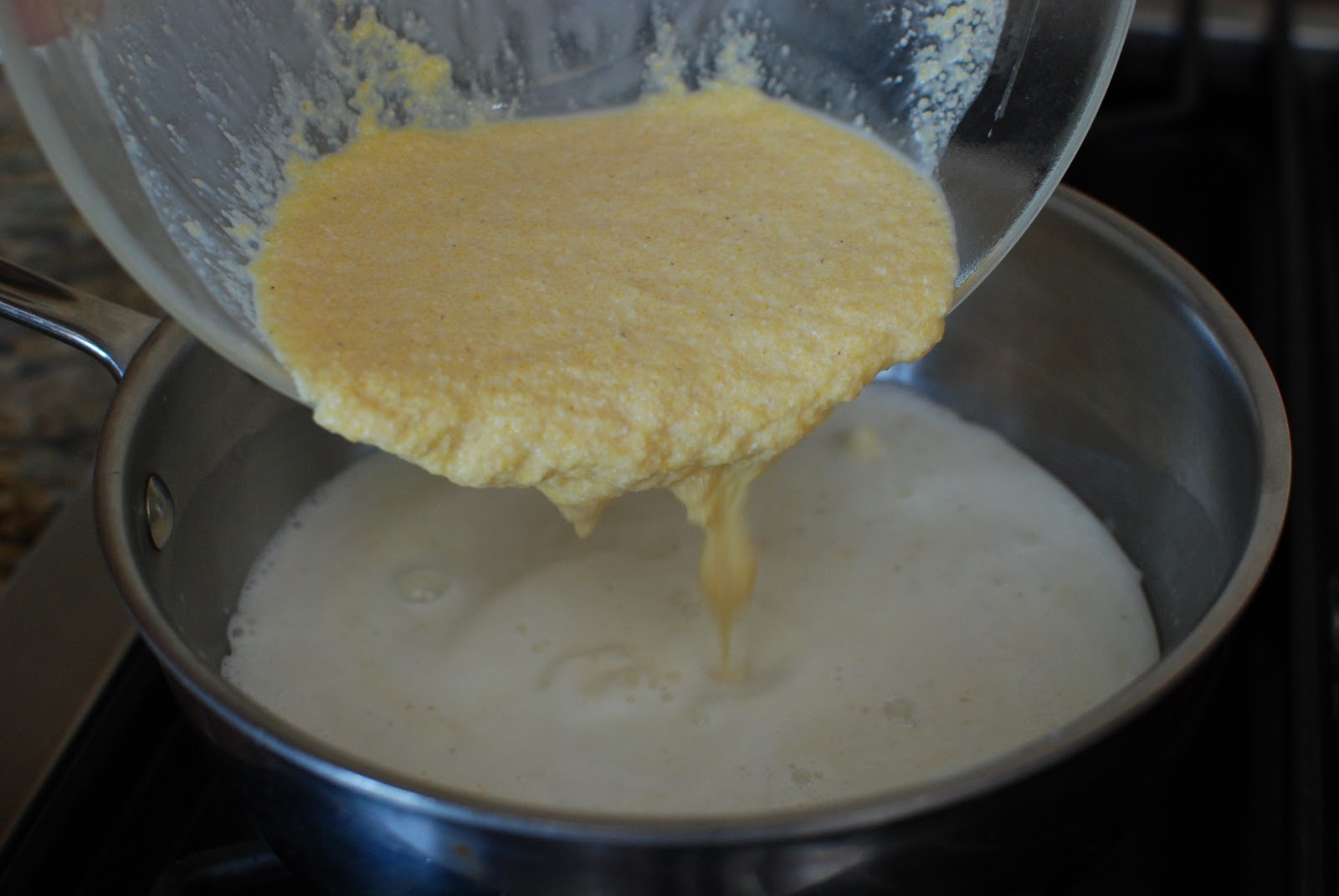 When the milk has scalded and begins to steam, add the cornmeal mixture.