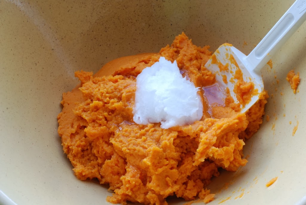 While the yams are hot add the coconut oil. In Utah my coconut oil is solid most of the year. I think it’s only been in a liquid state during August.