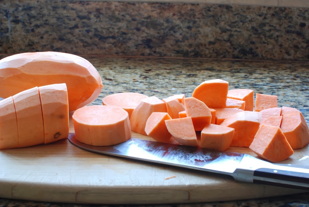 I’m peeling three large yams, which ends up being 4 cups once mashed.